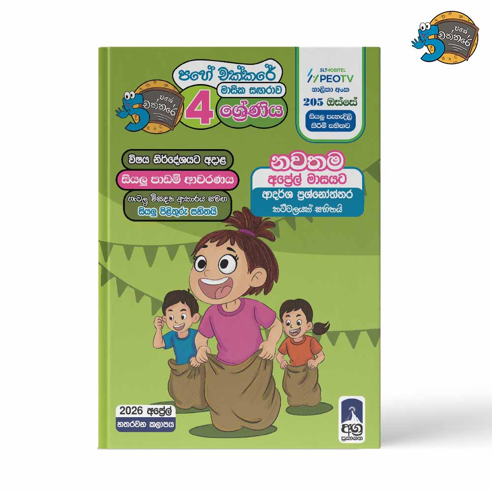 පහේ චක්කරේ මාසික සඟරාව. 04 ශ්‍රේණිය – 2026 අප්‍රේල් කලාපය (Pahe Chakkare Grade 04 April). පිටු 56 කින් යුත් මෙම මාසික සඟරාව තුල අදාළ මාසයට අයත් සියලු විෂය කරුණු පුනරීක්ෂණය කරනු ලබන අතර, අදාළ මාසයට ගැලපෙන ලෙස පෙර උගත් විෂය කරුණු ද ඇතුලත් කර නවතම ආදර්ශ ප්‍රශ්න පත්‍ර කට්ටලයක් ද ඇතුලත් වේ. ඉතාමත් ඉහල ඝනකම සුදු පාට කොලයේ මුද්‍රණය කර ඇත. සියලුම පිළිතුරු ගැටළු විසඳන ක්‍රම සහිතව ඇතුලත් වන අතර “පහේ චක්කරේ” අපගේම PEOTV (නාලිකා අංක 205) නාලිකාව ඔස්සේ මෙම මාසික සඟරාව පුළුල් ලෙස විග්‍රහ කරනු ලබයි.